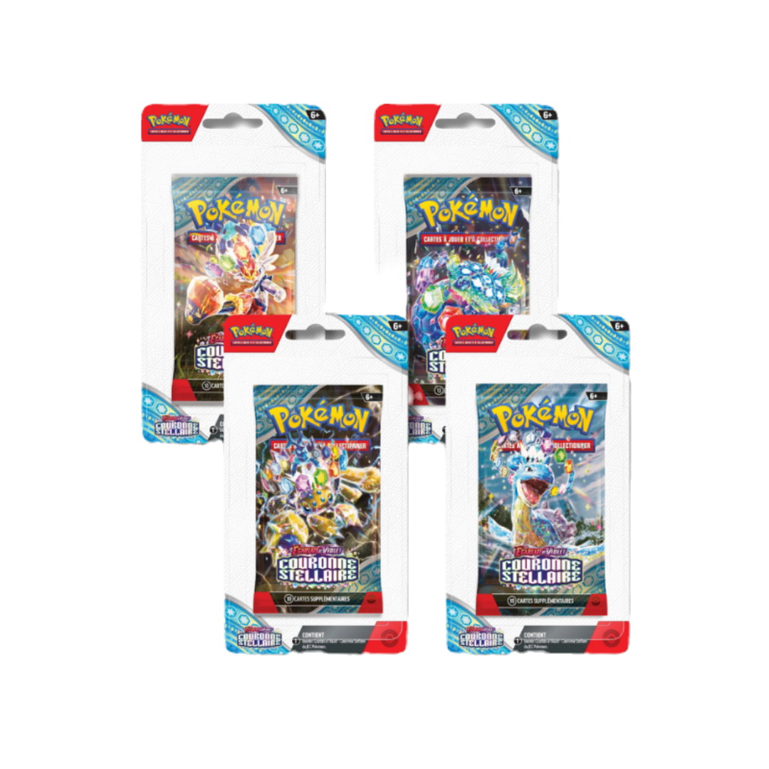 Plongez dans l'univers des EX Téracristal Stellaire avec les boosters sous blister de l’extension Écarlate et Violet : Couronne Stellaire. Chaque booster sous blister est disponible en quatre visuels exclusifs : Pyrobut, Mygavolt, Terapagos, et Lokhlass. Ces boosters contiennent des cartes aléatoires, vous offrant la possibilité de découvrir des cartes rares, des cartes Dresseur puissantes, et des illustrations spéciales qui rendent chaque ouverture unique et excitante.